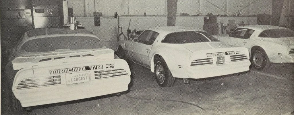 Some of the 1978 #50’s Macho T/A’s being prepped and painted. Note the front chin spoilers have been removed to have the lower accent painted. The decals were painted on using stencils, and the cars were all painted at an external paint shop.