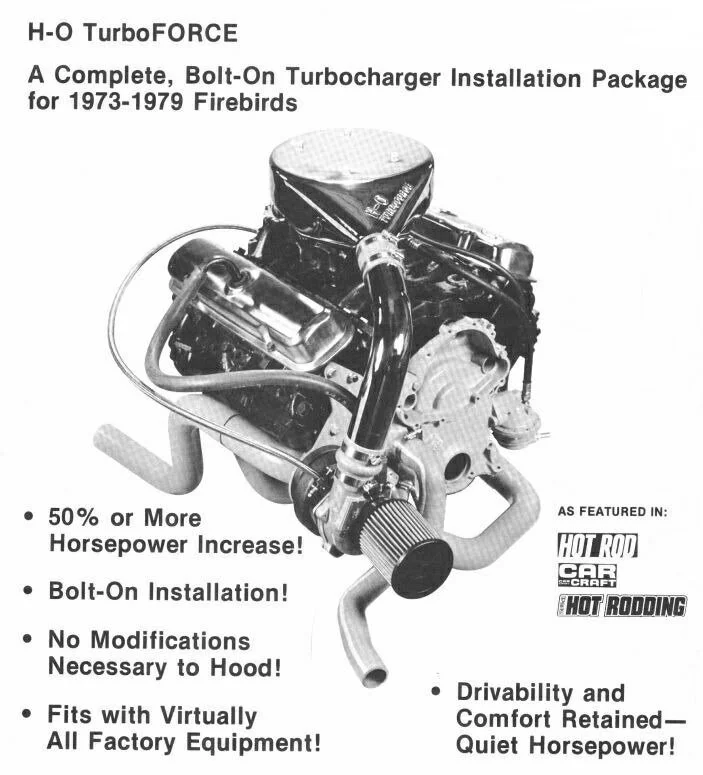 The big one everybody loves to see. H.O. Specialties offered a blow-through turbocharged induction setup on a number different types of engines, and DKM offered this kit as an expensive upgrade for the Macho T/A. To accommodate the H.O.S. turbo system, a number of other DKM options had to be installed to support this major upgrade. The Macho Turbo featured as standard equipment: